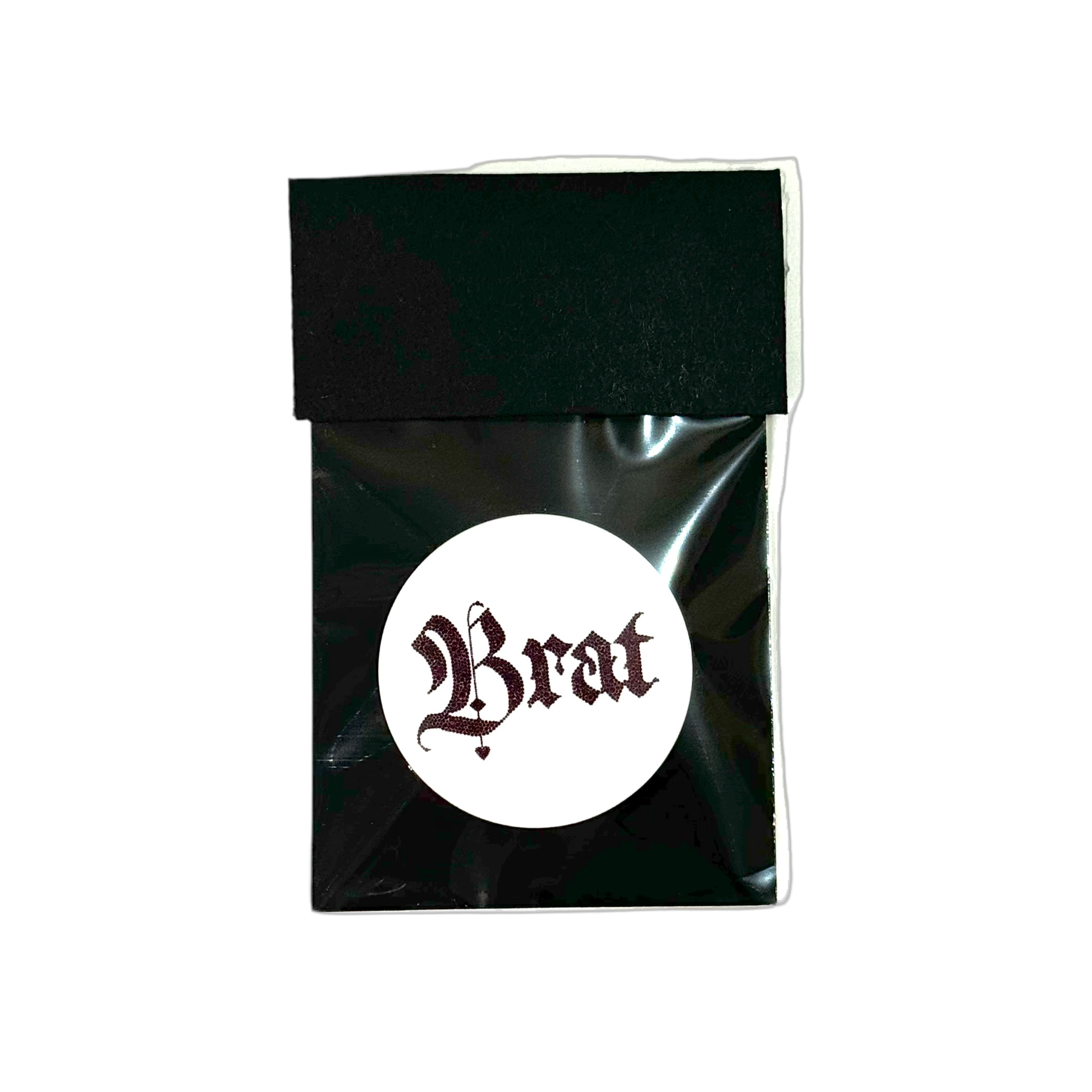 This BRAT PIN BADGE features a stunning 38mm design with a white background and bold gothic font. Adorned with a dark ruby rhinestone print, it is a striking addition to any outfit. Easily pin it on for an edgy and chic touch.